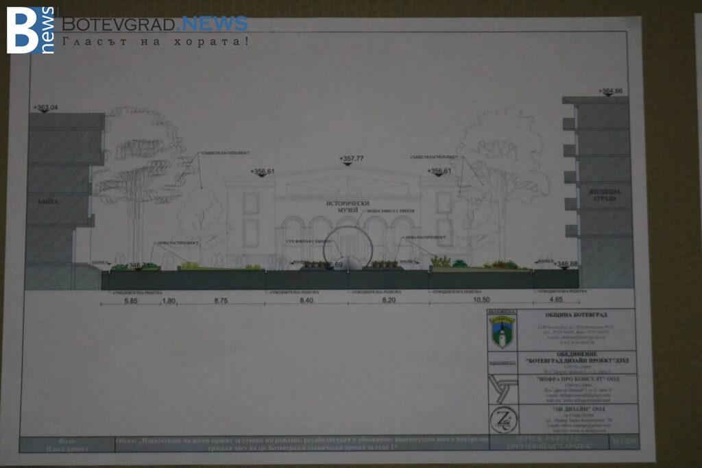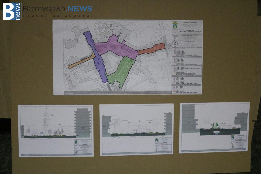 Проектът бе представен от арх. Лазар Чокаджиев от фирмата изпълнител – Инфра Про Консулт ООД. От представения идеен проект присъстващите граждани бяха запознати чрез визуализация за планираните промени в централна градска част. Сегашната изронена бетонова настилка се подменя с дълготрайни гранитни плочи, които да позволяват ремонтни дейности. Под тях ще бъдат разположени нови колектори и инсталации за осветителни тела и съоръжения. Периферните зони ще бъдат с паважна настилка. Обновяването на двата площада ще бъде с водещи оси, водещи към Часовниковата кула и Исторически музей.