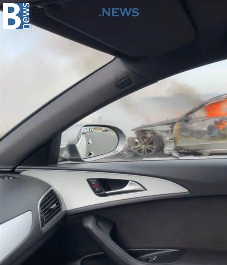 Кола се е запалила и гори на магистрала "Хемус". Видеото е заснето около 17:24ч., като се вижда, че пожарникарите се...